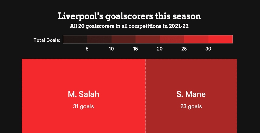 Główne postaci z linii frontu Liverpoolu przewodziły stawce w tym względzie, ale Klopp może być zbudowany wkładem Diogo Joty i sprowadzonego w styczniu Luisa Diaza, którzy zanotowali kolejno 21 i 6 trafień. Dotychczasowy tercet napastników Liverpoolu stał się teraz kolektywną piątką.