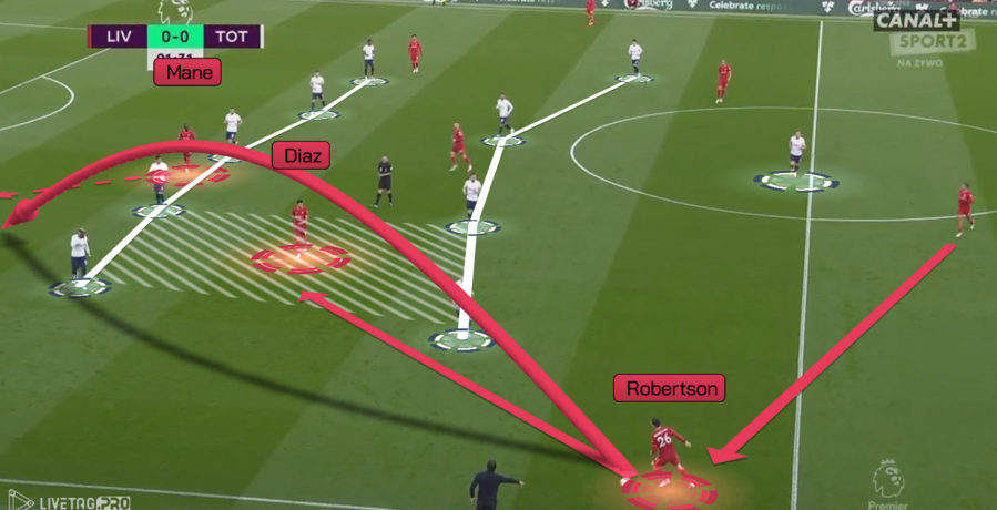 Liverpool od początku meczu konstruował ataki przeciwko Tottenhamowi, który ustawiał się w 5-4-1 w średnim i niskim bloku obronnym. Oznaczało to, że dwie linie gości pokrywały znaczną szerokość boiska i odcinały dostęp do większości stref bliżej bramki Hugo Llorisa. The Reds musieli więc bardzo sprawnie zmieniać kierunki akcji, by Spurs nie zdołali się przesunąć i by można było wykonać podanie między formacje (Diaz) oraz za linię obrony (Mane).