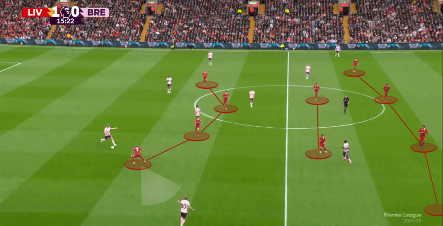 Podobna sytuacja wydarzyła się później, gdzie Bryan Mbuemo przeszarżował z piłką, a Liverpool szybko wrócił do swojego ustawienia z czterema obrońcami, trzech pomocników znalazło się za linią piłki, a Luis Diaz wrócił wspomóc obronę.